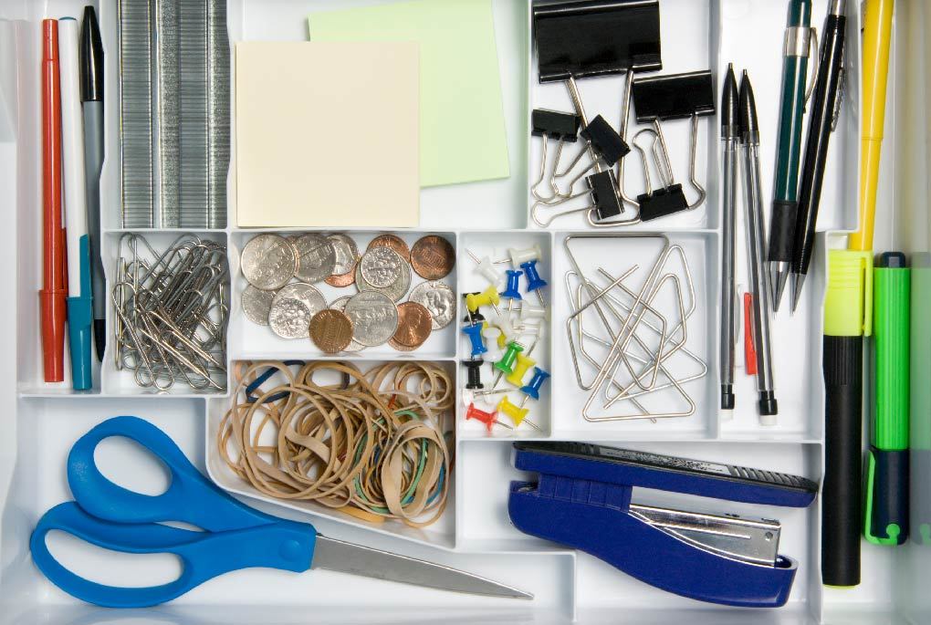 Make use of ice cube trays, IKEA drawer organizers, or even individual yogurt containers to organize your desk drawers. Paper clips, rubber bands, pens, and sticky notes should each have a home of their own.